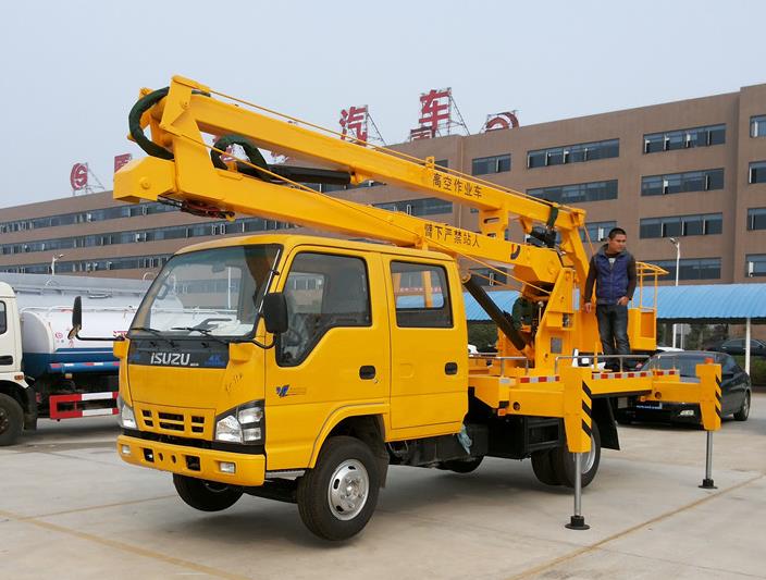 江鈴(新款)雙排工程黃駕駛室,軸距3360mm,江鈴115馬力國五發(fā)動(dòng)機(jī),油剎,五檔變速箱,7.00R16鋼絲胎,帶ABS.加裝空調(diào)。作業(yè)高度14米,液壓360度全回轉(zhuǎn),三節(jié)折疊臂,1噸可伸縮式吊鉤。